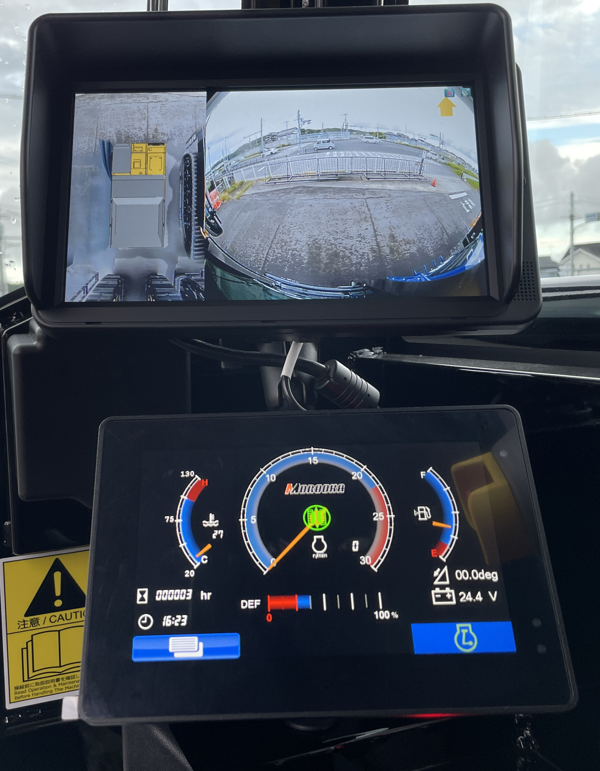 Warning lamps and the LCD monitor are located centrally on the right side of the operator’s s seat. Various statuses related to the vehicle such as remaining fuel level, voltage, engine speed meter, warning lamp lighting, etc. can now be easily checked. In addition, the newly installed 360-degree camera makes it easier to check the front, rear, left, and right sides of the vehicle.